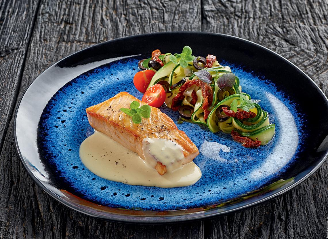Pavé de saumon, crème de haddock et spaghettis de courgettes